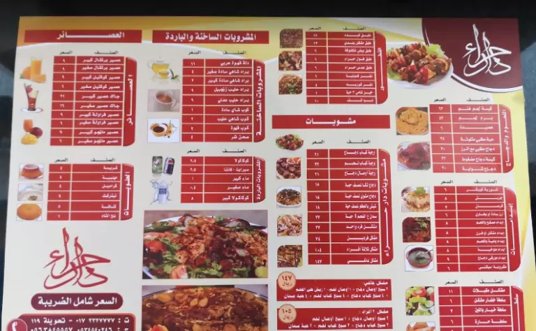 أما عن قائمة الطعام الخاصة بمطعم دار حراء فتشمل الأطباق الموضحة في الصورة التالية:
