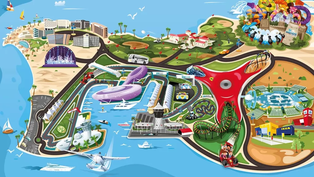 حيث تبعد عن ملاهي ياس ووتر وورلد بمسافة تُقدر بحوالي 3.21 كيلو متر، وهي عبارة عن مدينة ترفيهية ساحرة، وتضم مجموعة فريدة من الألعاب التي تستقطب الأطفال بشكل خاص.