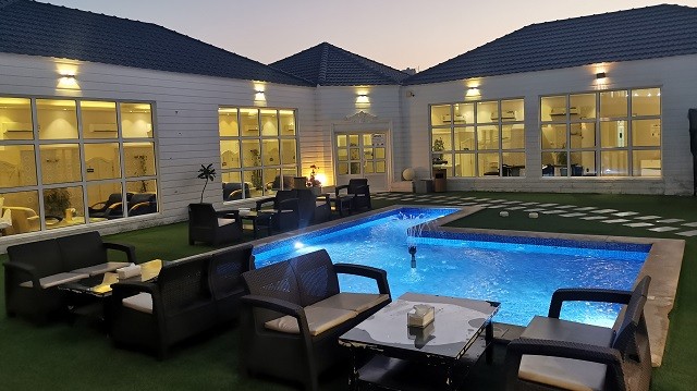 يتواجد هناك حمام سباحة رائع وكبير، وفي وسطه نافورة جميلة، وتستطيع أن تستمتع بتناول أشهى الأكلات المحلية والعالمية.